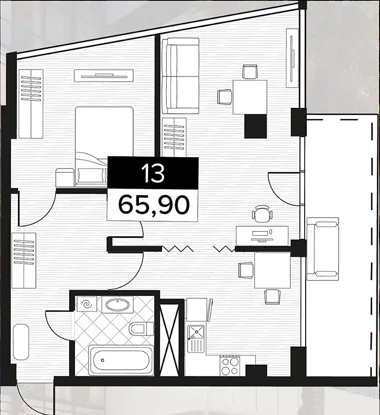 Этот аппарт находится в центре Адлера на первой береговой линии и будет сдаваться в посуточную аренду. Застройщик предлагает такую планировку. Мое пожелание - отсутствие перегородок, кроме санузла. Хотелось бы чтобы зона гостиной и кухни, а также спальни были в одном пространстве без перегородок. Буду очень благодарен за рекомендации по планировке.