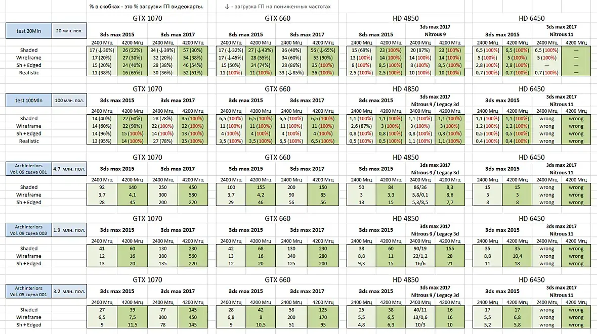 Тест показывает, что рабочие режимы сцены не нагружают видеокарты 1070 и 660 полностью, кроме режима Edged в 3ds max 2017 для 660-ой. Причем только лишь разгон до 4200 смог полностью нагрузить карту.