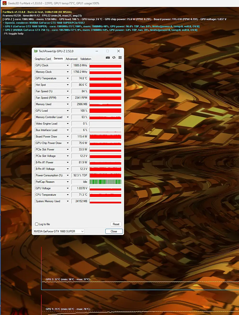 Фоном во время тестов я бы запускал GPU-Z и после 2-3 прогонов Суперпозишена я бы смотрел на (Max/Avg) значения - HotSpot, Памяти, Нагрев GPU, % оборотов вертушек, PerfCap Reason (что бы ничего не троттлило).
