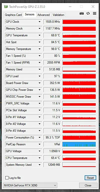 Вроде бы Board power draw под 350 ватт, что адекватно для 3090, да и гпу загружен под 100% Но меня беспокоит ограничение видяхи по Vrel, это имхо происходит от стабильности питания, а ещё больше беспокоит то, что по всем линиям у меня сильно не 12 В.