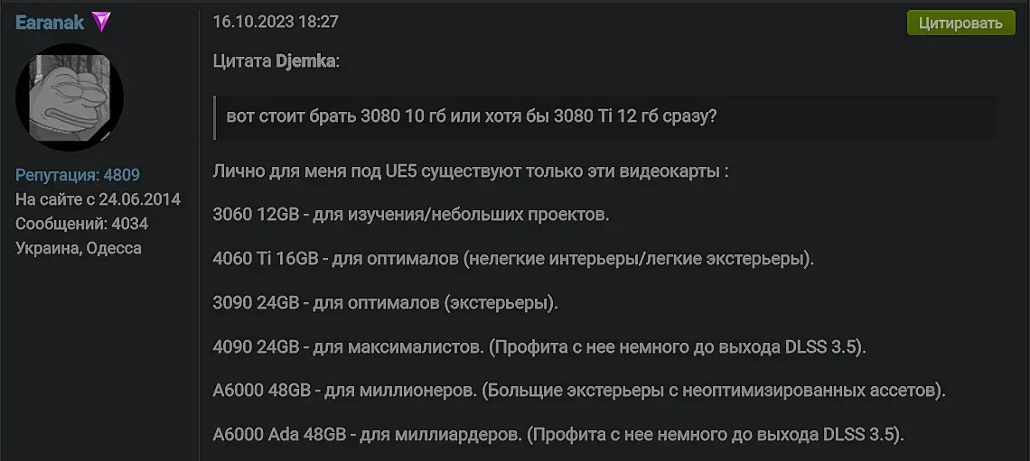 Да, я видел что по другим параметрам она мощнее, но вот volad_Bo писал что для анрила важнее именно объем памяти. И Earanak вроде бы советует либо 4060 либо уже 4090 а про 4070 не писал, а он авторитетный человек в этих вопросах))) Корче я теперь запутался)) все таки лучше переплатить и взять 4070ti?