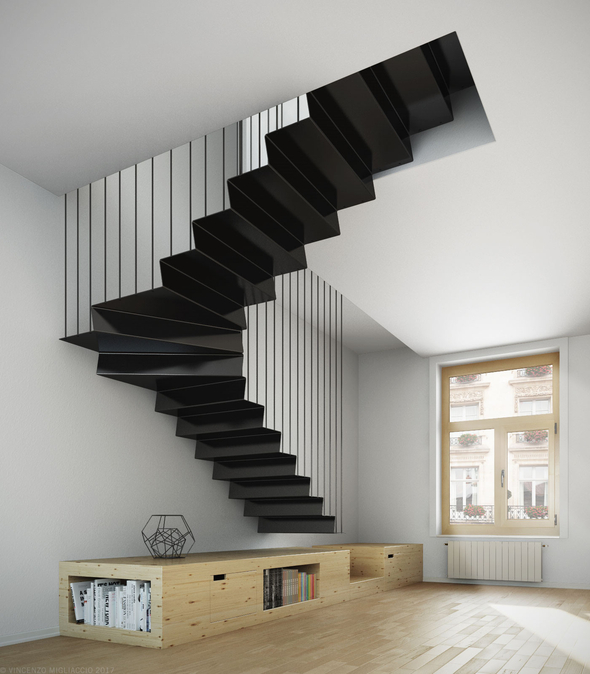 Сделал планировку, все помещается и все устраивает. Основной вопрос возникнет с лестницей. Предполагаю, что мне нужна стальная, на некоторых полу-декоративных подвесах, типа такой, как в примере.