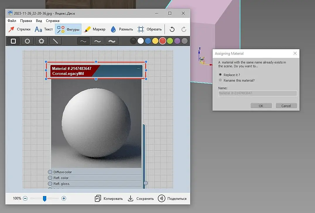 Не понятно как, или я сам такое название дал, что сломал макс, или такой материал был где-то в моделях, но теперь такой материал у меня поселился в библиотеках с моими сборками.