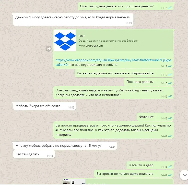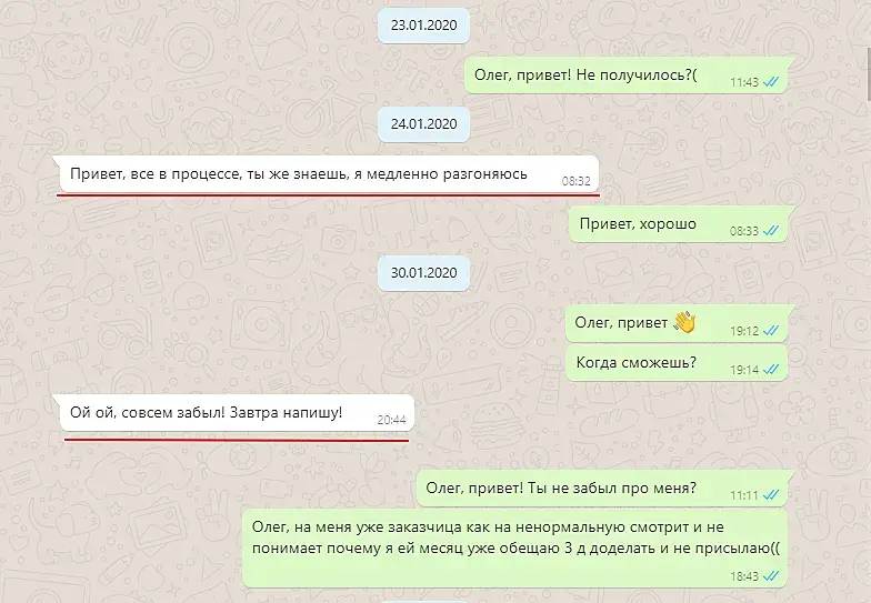 1) Принципиально невозможна ситуация "потерялся, подвел по срокам" и т.д. - мы садимся за работу и выходим из скайпа только тогда, когда конкретное помещение или объект полностью закончены. После этого остается рендеринг, этим занимается мой компьютер, он подводит меня по срокам крайне редко, а потеряться от меня не пытался пока ни разу.