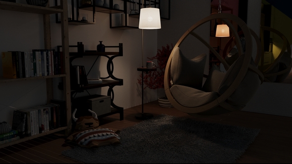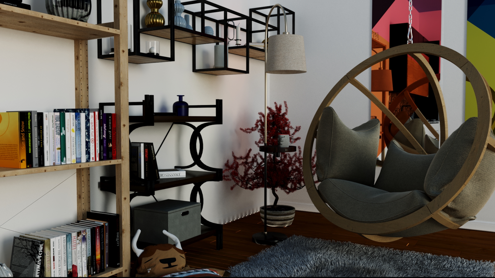 Скорее всего, если не принципиально именно этот интерьер выставлять, вам было бы проще найти красивый реф с уголком для чтения, который вам понравится, и попробовать его повторить. Там будет видно и как свет поставлен, и как материалы должны выглядеть, и с дизайном не будете заморачиваться. Только при заливке автора референса не забудьте указать. Имхо, конечно
