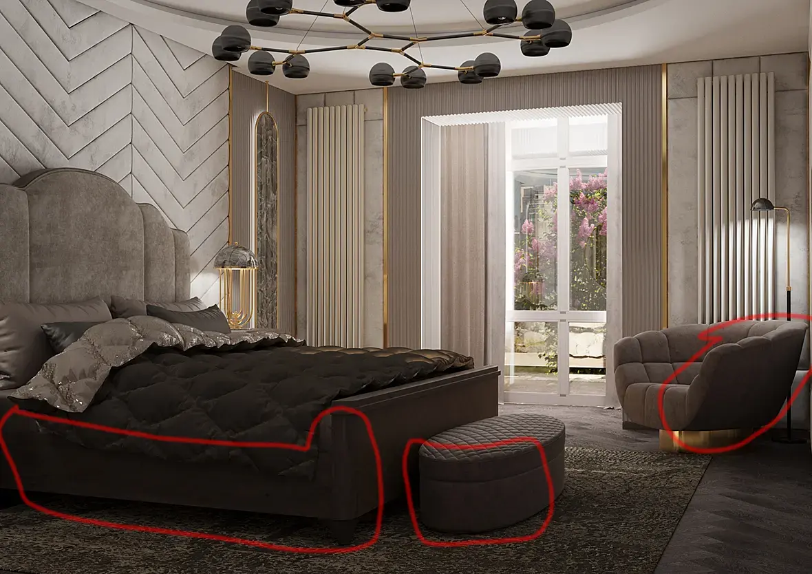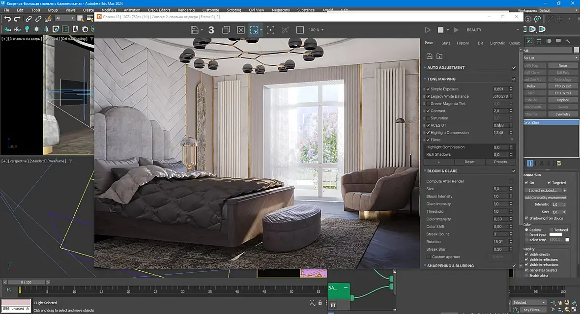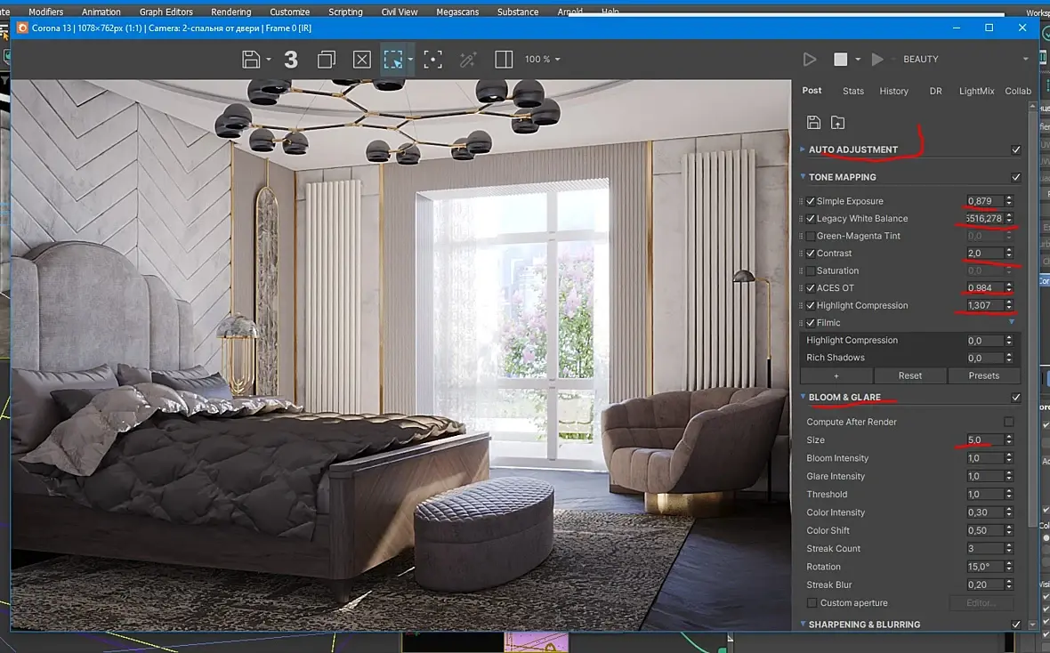 Всем привет, отредерил сцену, всё бы хорошо, только на неосвещенной части объектов плохо проявилась текстура, будто грязными пятнами покрыта, рендерил в короне, прикладываю скрин рендера и настройки, были приняты попытки добиться мягкого освещения в интерьере из окна, без включенной люстры. в оконный проем вставил корона лайт прямоугольный.