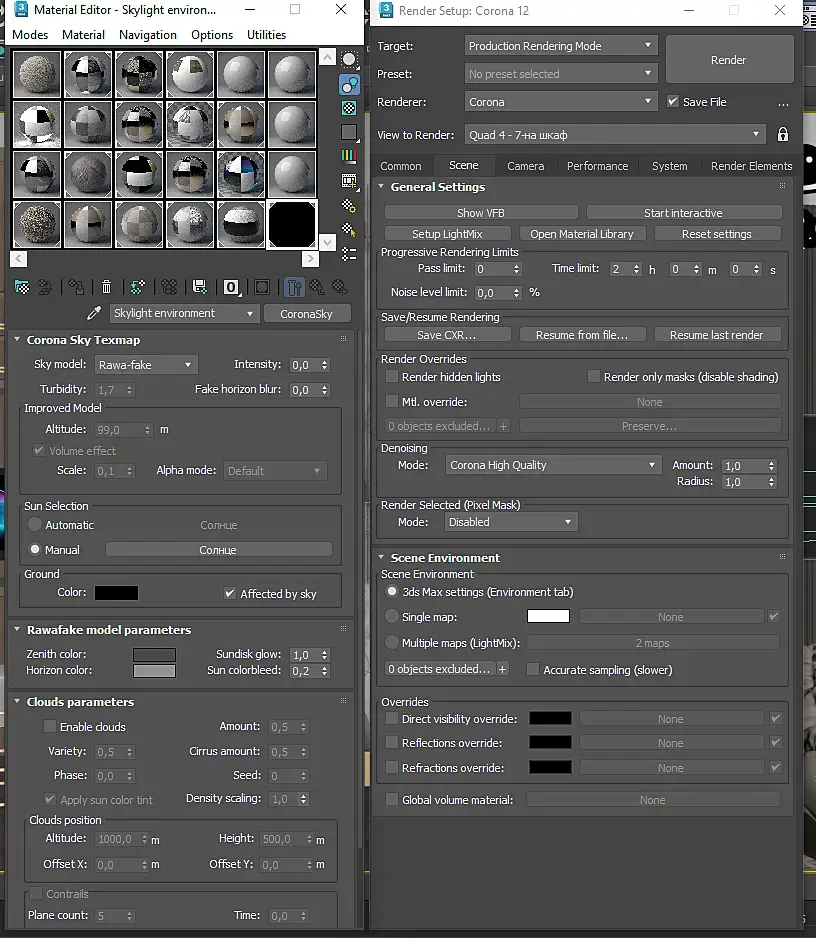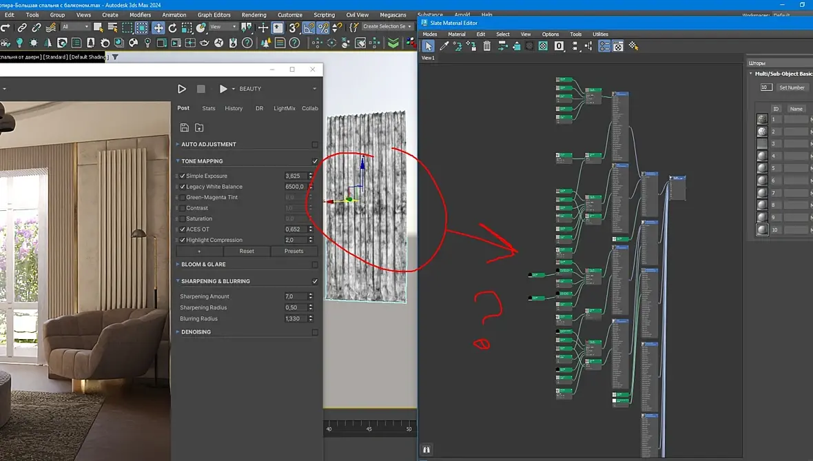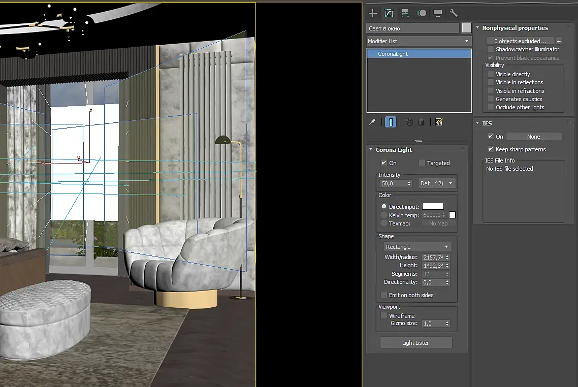 Что по поводу тюли. Я взял стандартный и библиотеки короны. Слегка параметры изменил некоторые. Вы повесили такой материал, что плохо свет проходил.