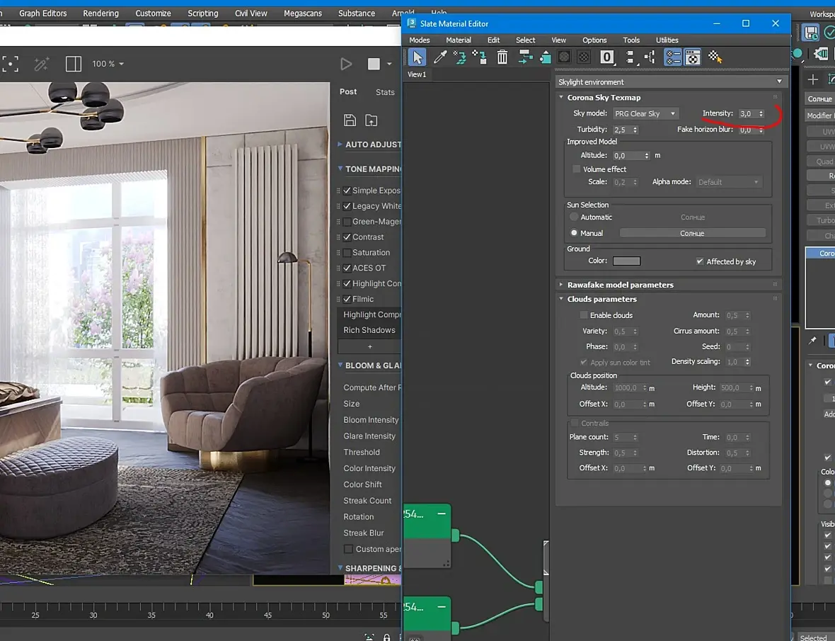 Видимо без постобработки рендера в фотошопе не обойтись. Я хочу чтобы при более слабом освещении из окна сцена была более освещённой, в реальности так и бывает, достаточно просто общего дневного освещения не большого и интерьер бывает достаточно хорошо освещен даже в тени объектов, а в максе всё не так