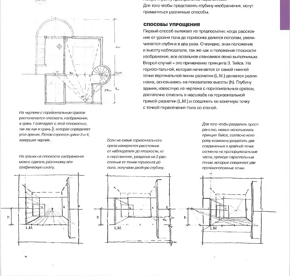 Сложное какое-то название (это не перспектива с двумя точками схода?). А разговор в принципе Тейса идет про то, что если взять отрезок параллельный "картинной плоскости"и разделить его на равное кол-во частей, то прямые проведенные из этих точек в мнимую точку схода поделят любой другой отрезок на равное кол-во частей, но уже в перпективном отобажении.