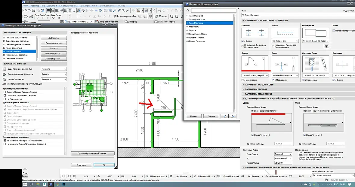 Вопрос модельный вид и фильтр реконструкции.В модельном виде установлено дверь символ "низкий закрытый"А реконструкция однозначно показывает полный и открытый.???