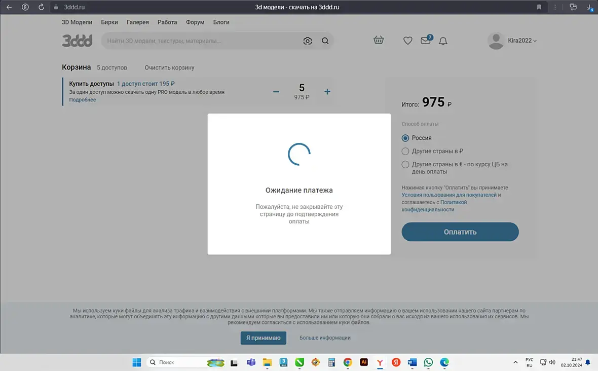Здравствуйте. Не получается купить модель. Если из корзины, то пишет не покидайте страницу оплаты, и пол часа ничего не происходит. Оплатил два доступа. Если захожу на страничку товара и жму «купить за один доступ», всплывает окошко скачать HTML, и приходит страничка с ошибкой 404