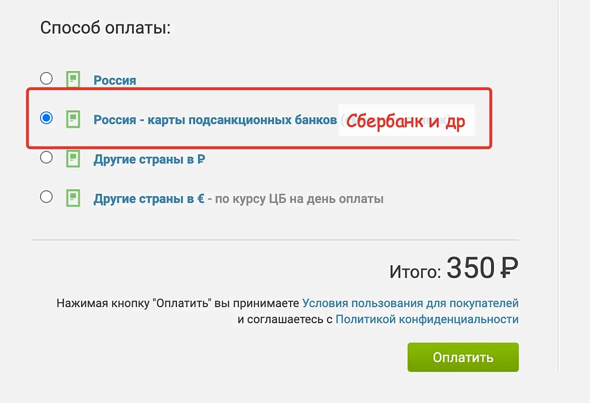 При оплате картами подсанкционных банков выбирайте второй способ оплаты:Россия - карты санкционных банков