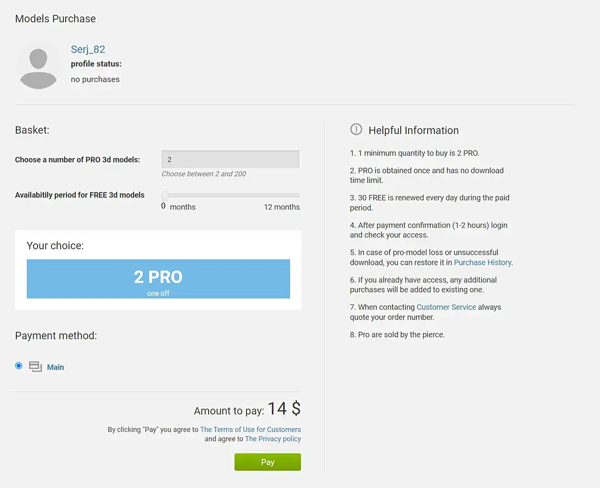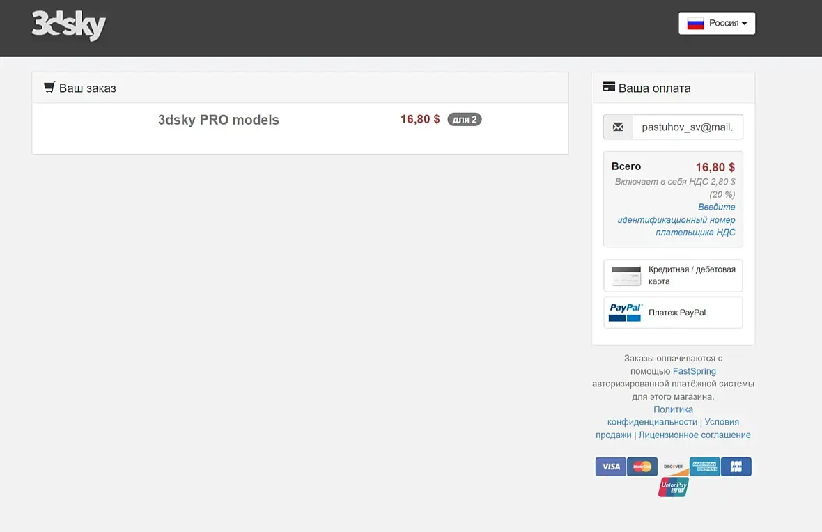 Здравствуйте. Хочу купить купить про модели на 1 месяц. Когда перехожу в оплату, переносит на сайт https://3dsky.org/user/account, где нужно 18 долларов. Оплата по карте тинькофф не проходит. Такого способа оплаты, как на картинке ниже не показывает. Подскажите, пожалуйста, как оплатить модели российской картой?