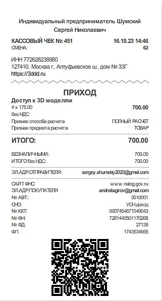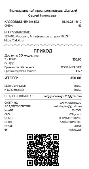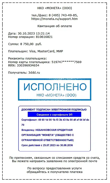 Добрый день! Аналогичный вопрос: При оплате моделей через НКО "Монета" пришла только квитанция об оплате, нужен полноценный чек как при оплате через сервис "Робокасса". Накладная с количеством позиций и указанием реквизитов сторон тоже подойдёт. Пожалуйста, помогите с решением. Заказ: 08E6F3F09