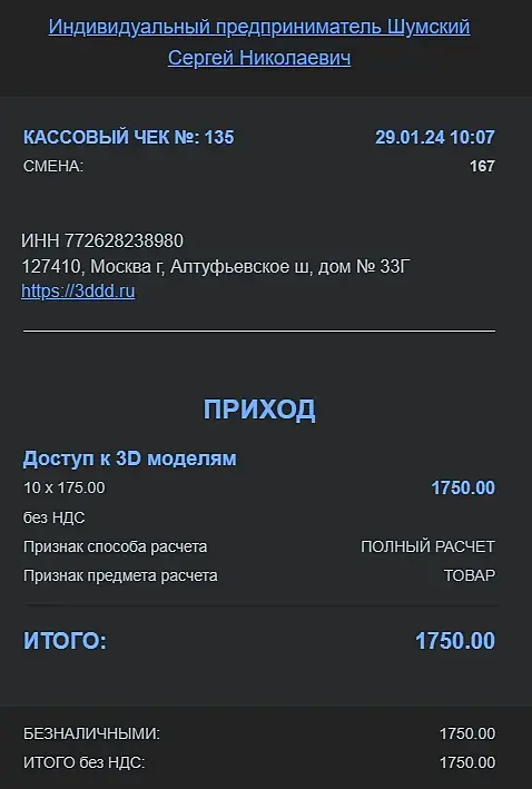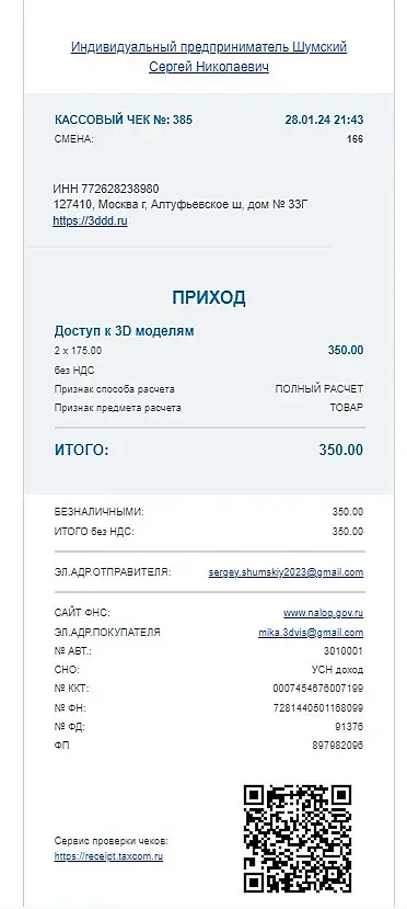Спасибо за ответ! На почту мне пришло только сообщение о, том. что опалта прошла успешно. Ничего другого я не вижу в почте. И у модели, которая мне была нужна, появилась кнопка скачать, но при нажатии ничего не происходит , модель не скачивается.