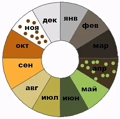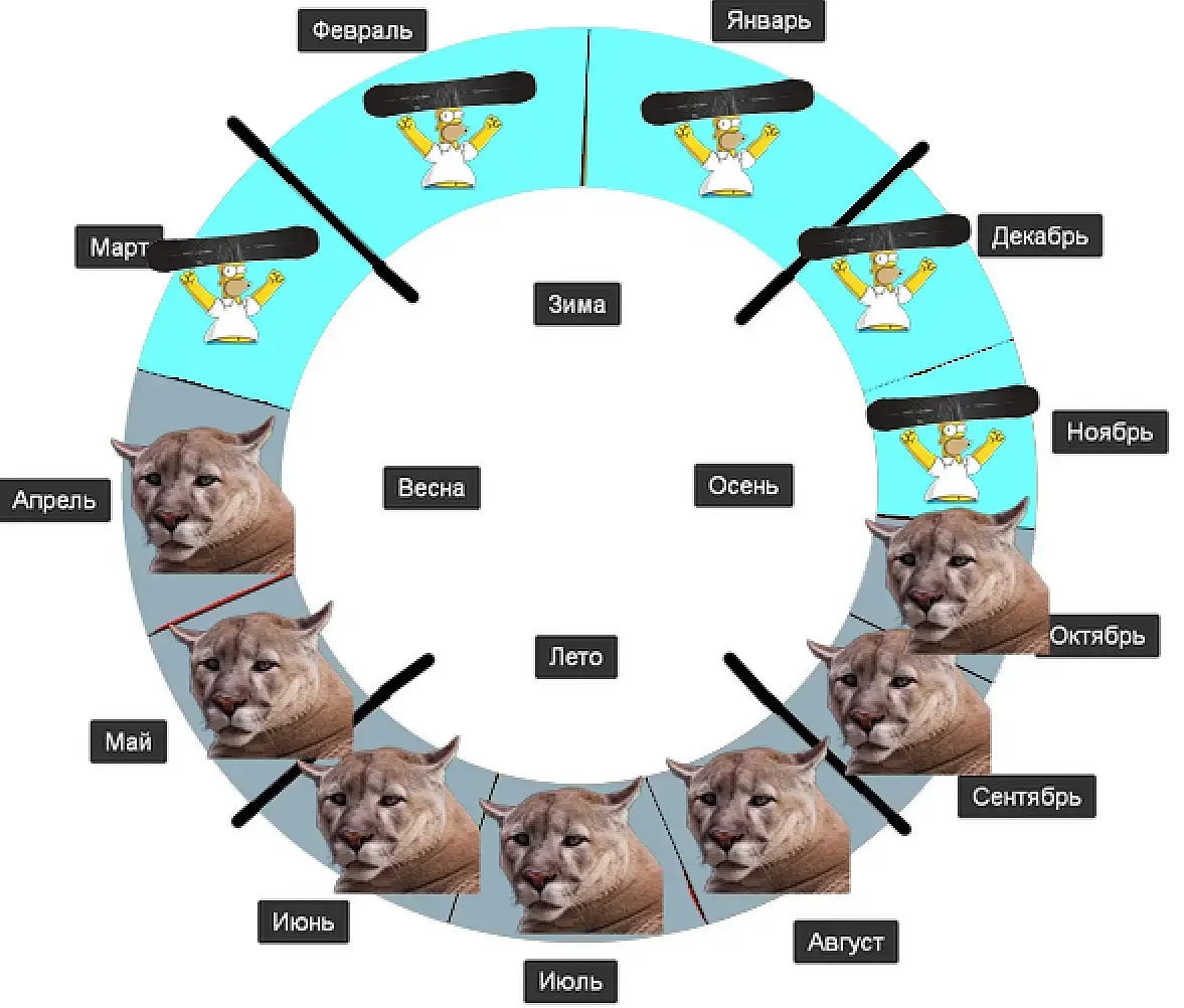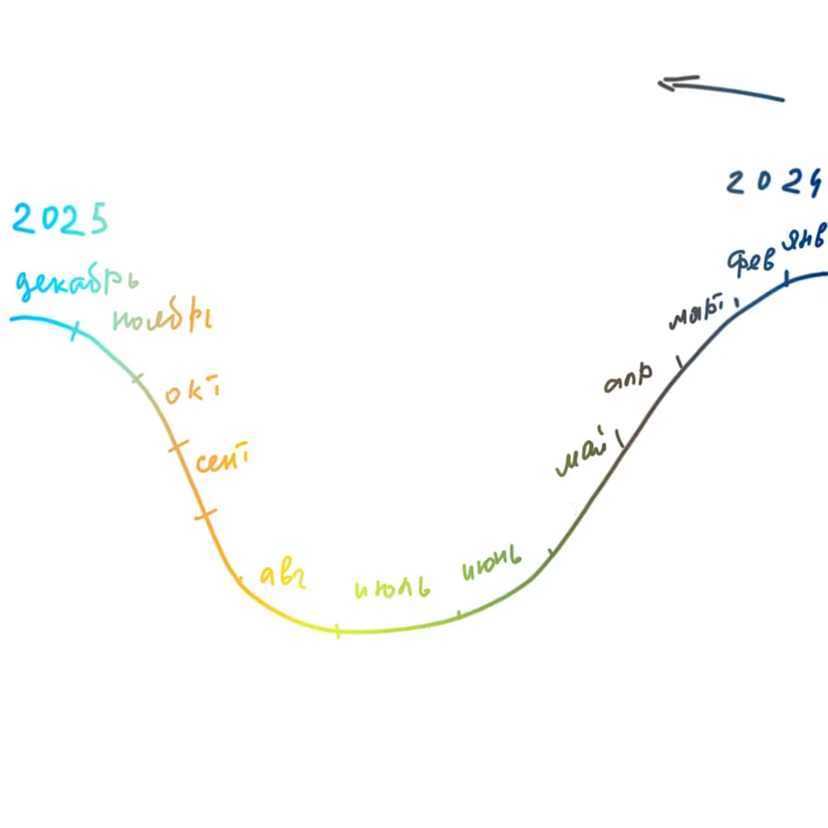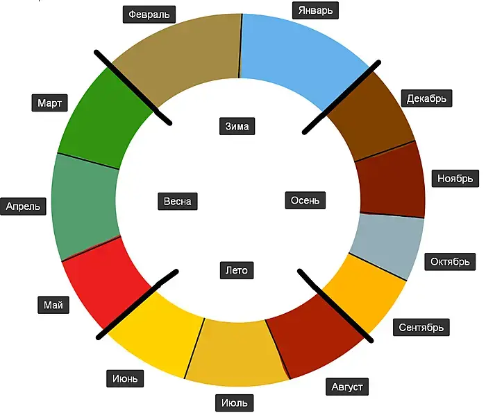 у меня время это что-то вроде графика косинуса, и идет справа налево. месяцы в цветах от темных холодных к ярким и теплым