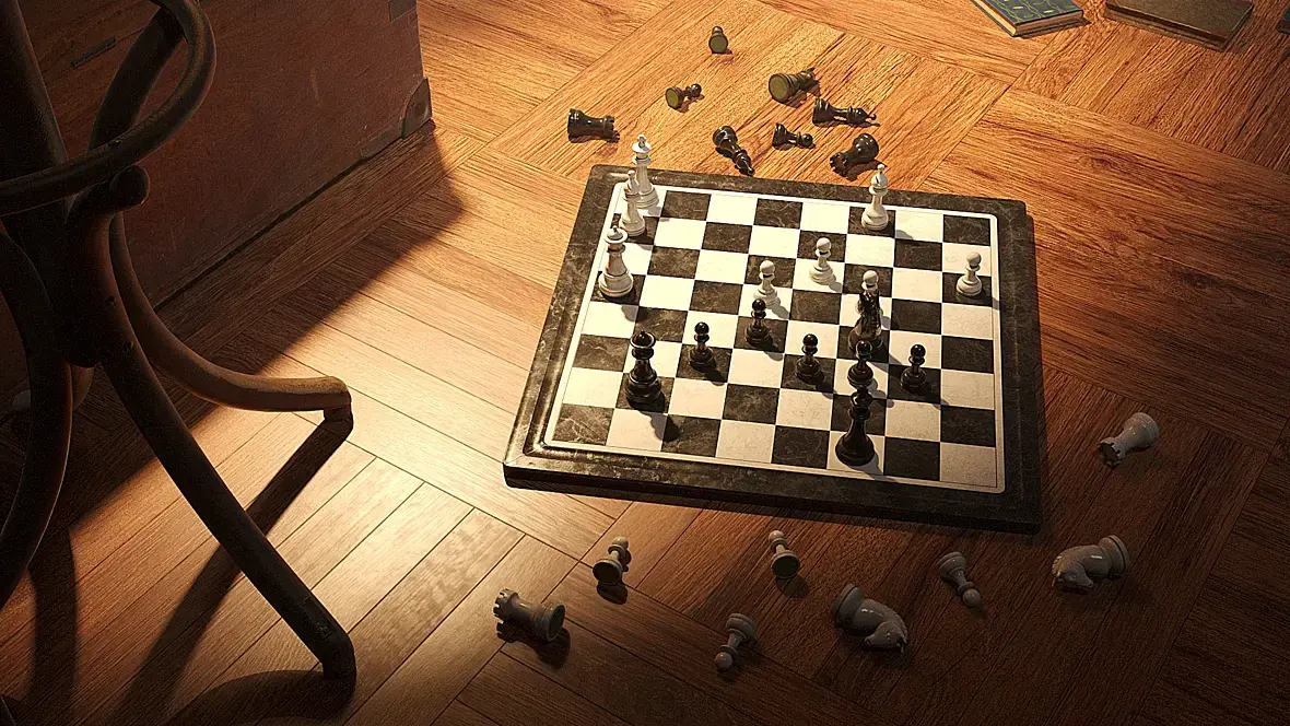 Добавил занавеси, шахматы, печатную машинку, стулья, пол поменял материал... Добавил второй ракурс камеры