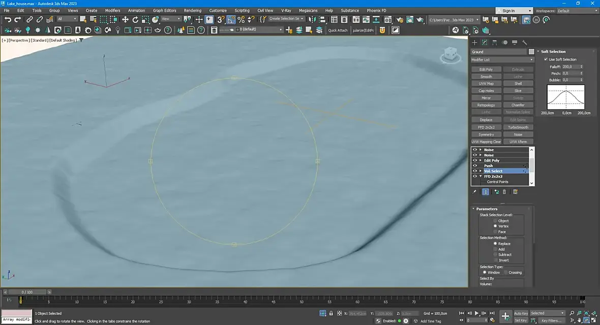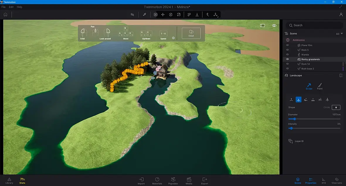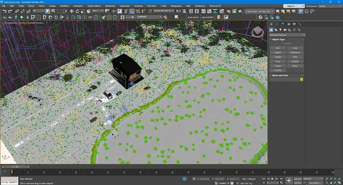 Из плюсов встроенные модели деревьев, травы. Машины, техника, люди. Для архивиза и презентаций штука классная. Инструменты для ландшафта нормальные.