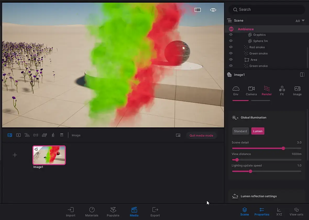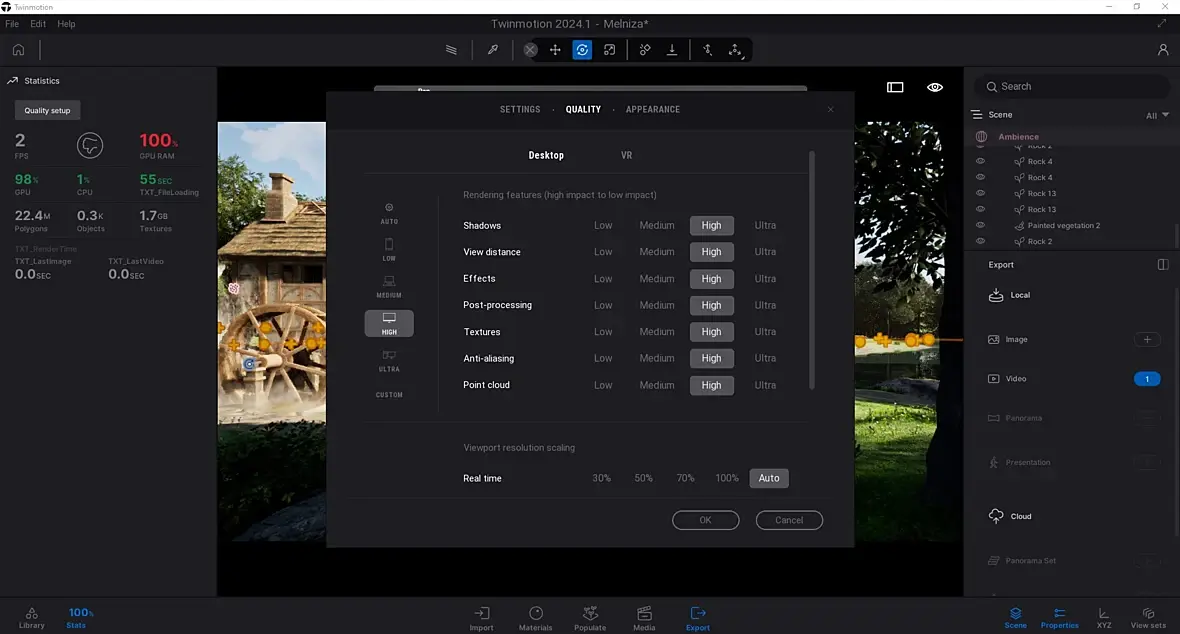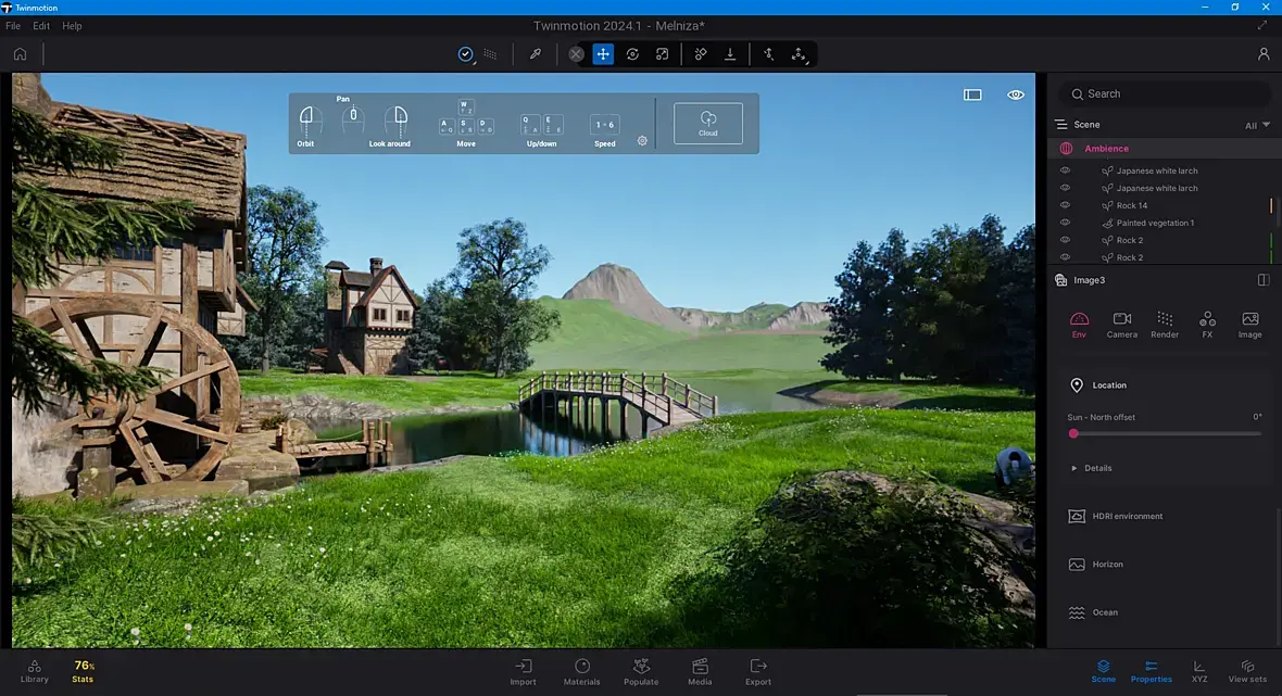 рендерит норм, но вьюпорт лагает. с растительностью сложно работать. наверное сильно большую сцену начал делать