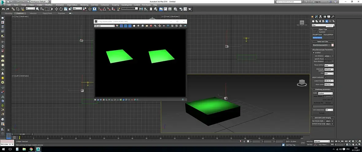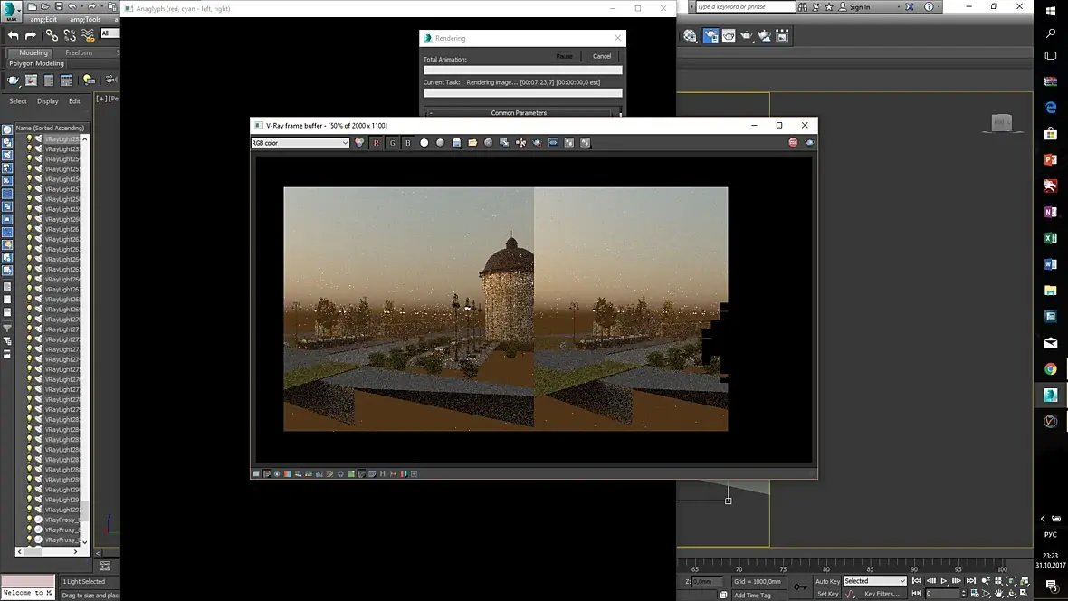 У Вас включен режим стереоскопического рендера для очков VR. Включается он в хелперс-вирей-вирей стереоскопик (на скрине). Найдите в сцене объект похожий на камеру мелкую и удалите (он тоже есть на скрине).
