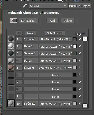 Добрый день. Стены являются одним объектом и имеют материал Multi/Sub-Object и уникальные саб маты для каждого полигона, среди которых есть материал кирпича с Displacement картой, назначенной на один из полигонов стен. Но во время рендера в режиме ActiveShade Mode выдавливаются все полигоны объекта "Стены", не смотря на то, что на остальных полигонах не назначена карта Displacement. Если убираю галку с этой карты на суб материале "Кирпич", то геометрия перестает выдавливаться. При рендере в режиме продакшн, такой проблемы не наблюдается