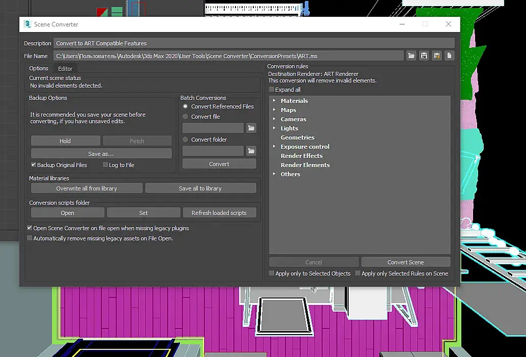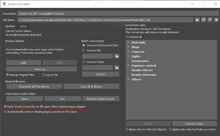 Спасибо большое!!!!установила корону, все предметы стали корректно отображаться!!!И да сцену чистила prune scene до этого. Скажите, а если всегда при импорте модели выскакивает диалоговое окно конвертации....как его отключить?