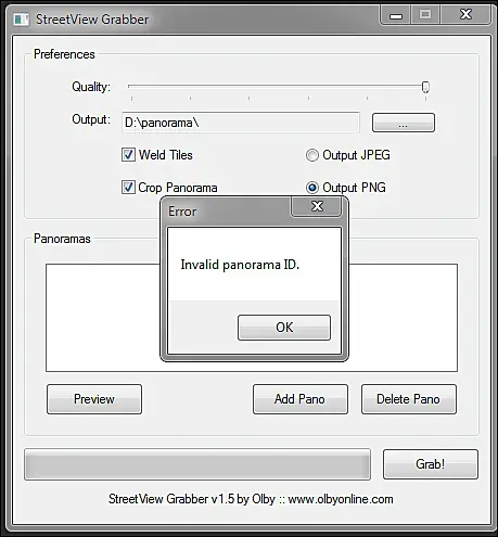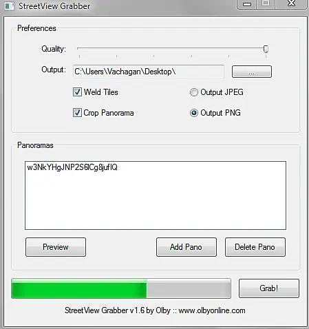 Открываю нужную панораму. Копирую ссылку из адресной строки. Нажимаю на кнопку "Add Pano". В окошке Panoramas, появляется название будущего файла. Нажимаю Grab!