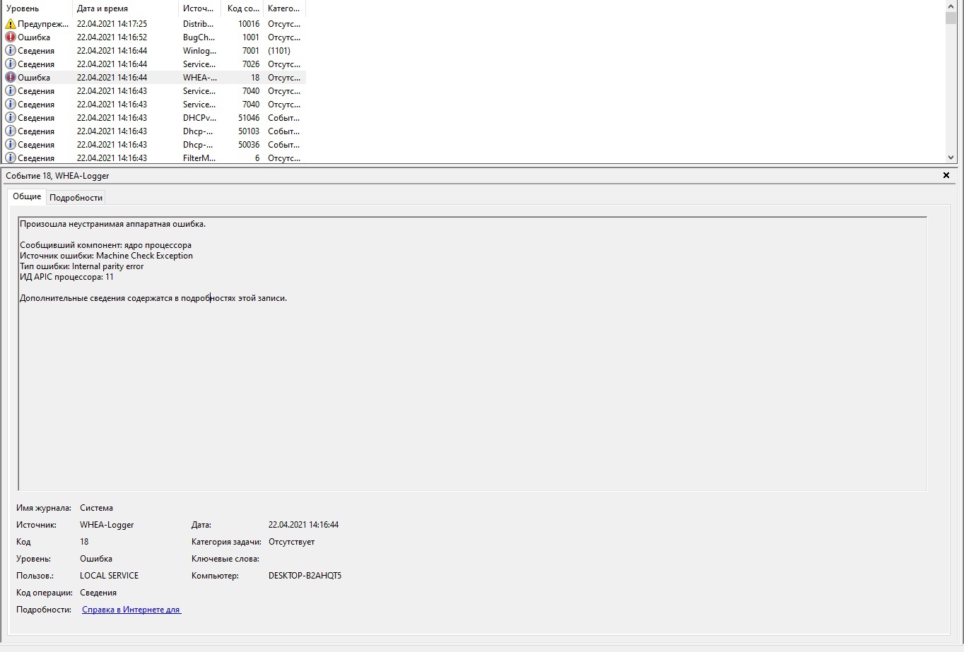 Сообщивший компонент: ядро процессораИсточник ошибки: Machine Check ExceptionТип ошибки: Internal parity errorИД APIC процессора: 11