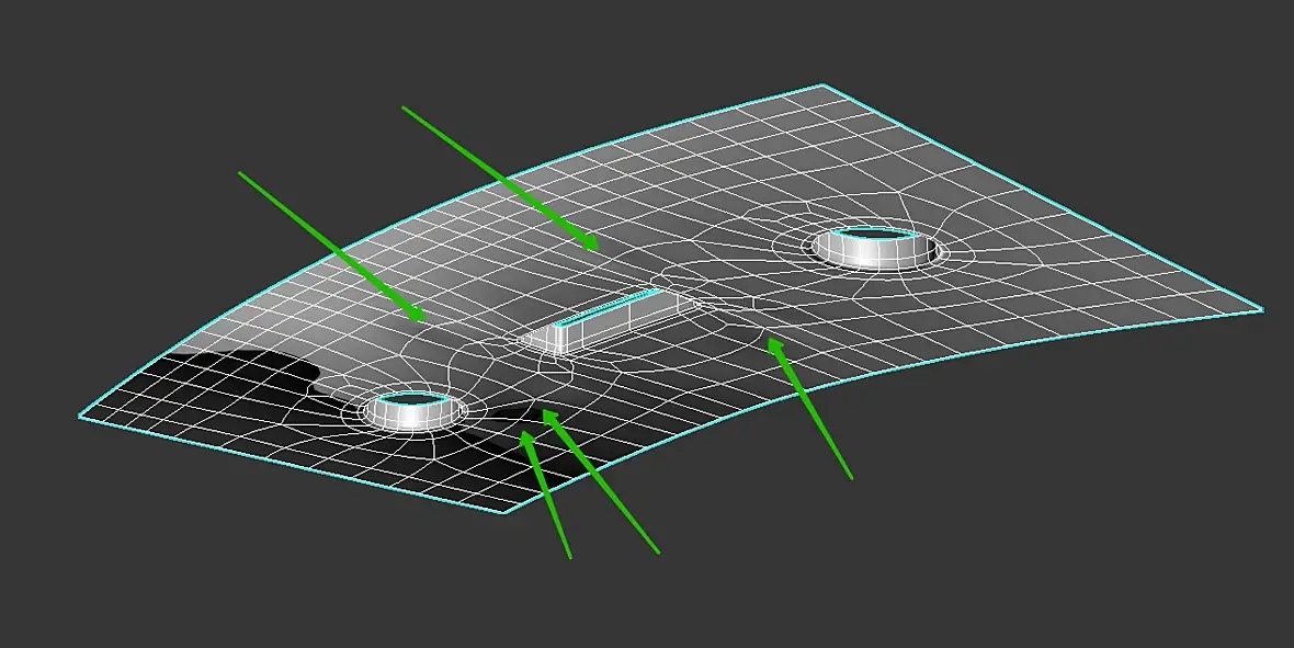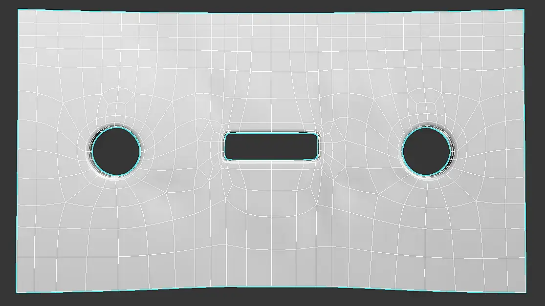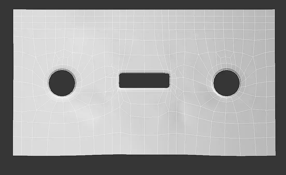 Выделяете бордер этого элемента , создаете по нему шейп , опускаете на 0.1 мм ниже , переводите в поли , соединяете верширы которые уже есть с оригинала , у вас выходите гладкая поверхность без бугров , заходите в риббон во фриформ , выбираете новосозданую поверхность как сюрфейс , переходите в ваш элемент с дырками , и с топа конформом давите загулявшие вершины , они выравниваются по нижней гладкой поверхности , ах да давите хайпольку , так как из-за сетки , даже с ровной поверхности лоупольки на смузе у вас полезут сопли . Все это займет у вас минут 5 .