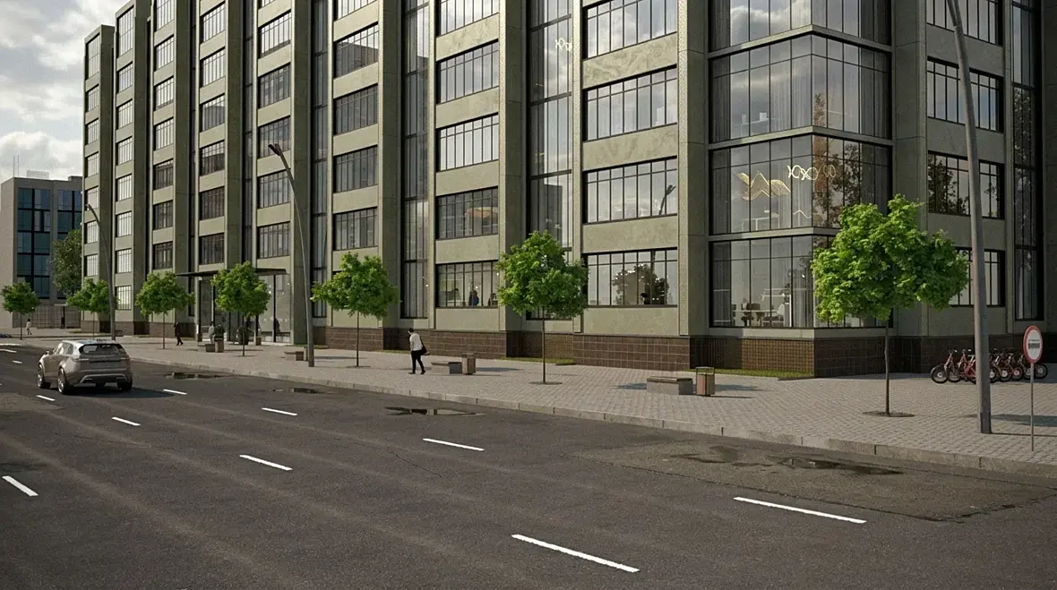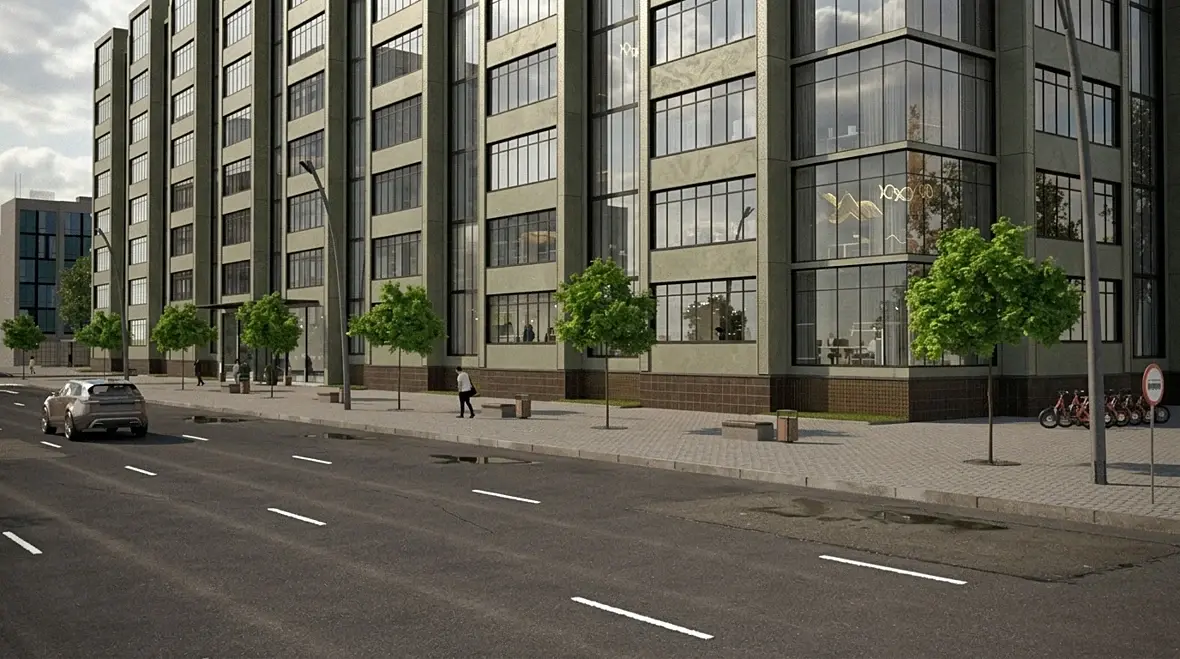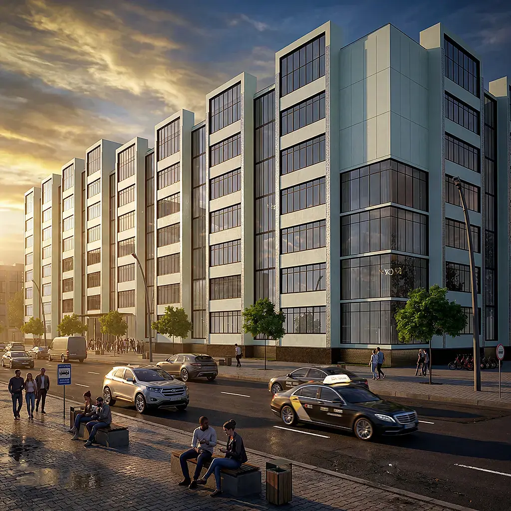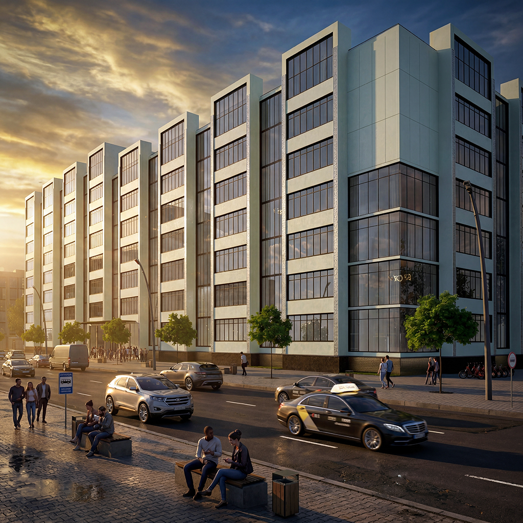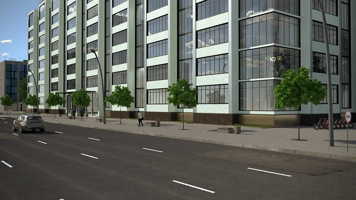 Ну у вас проблемы со всем тут. И неважно, какой тип жилья, хоть бюджет, хоть люкс. Свет плохой очень. Шейдеры не оч, особенно асфальта и плитки. Про композицию кадра вообще молчу. Если хотите обучиться, возьмите подобный кадр у крутой студии виза и попробуйте повторить постановку камеры, свет, шейдеры, детали.