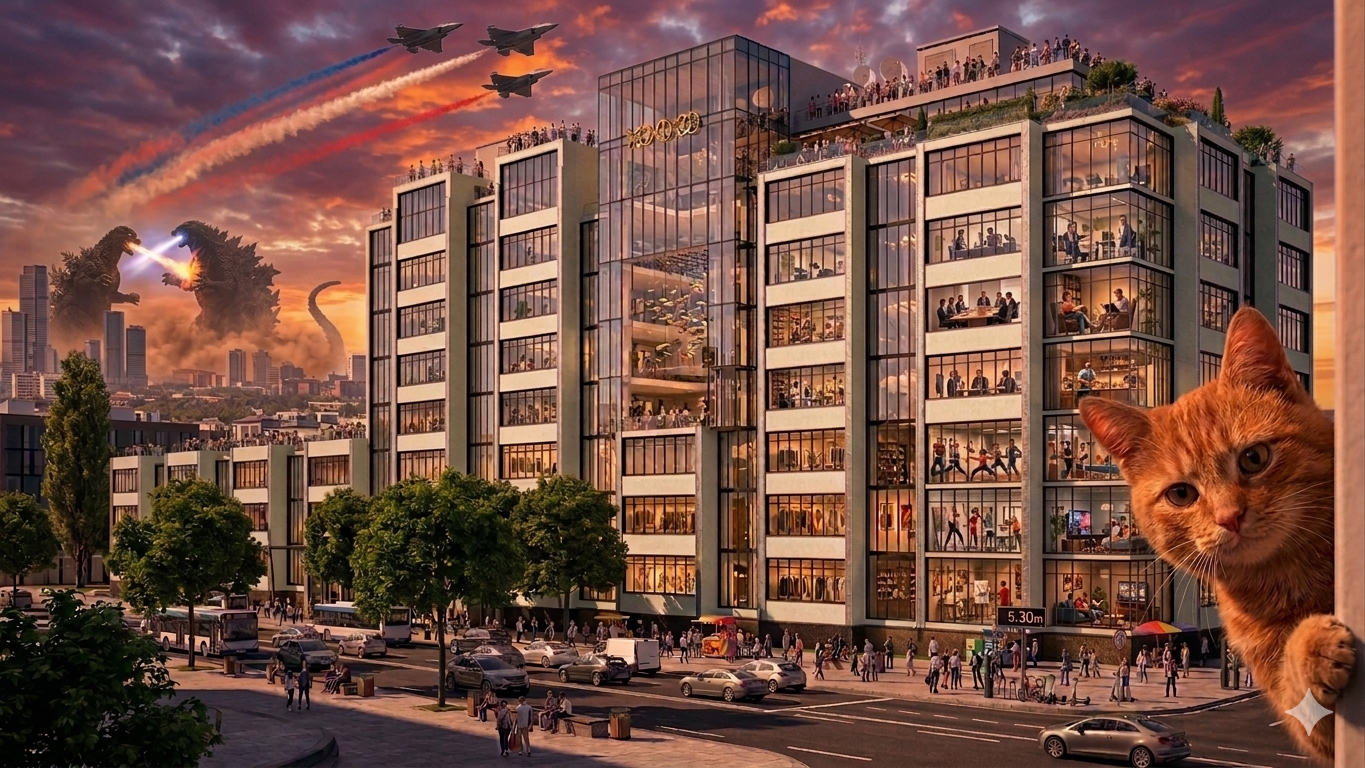 Я, конечно, не эксперт, но, что-то у меня сомнения, что в такой солнечный день, будет виден так сильно внутренний, искусственый свет в окнах. Ну разве, что бананно.