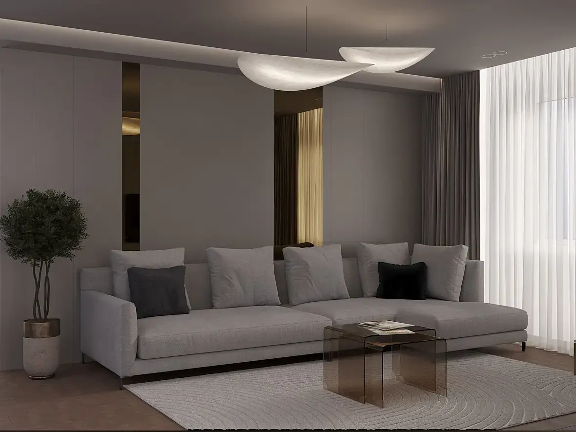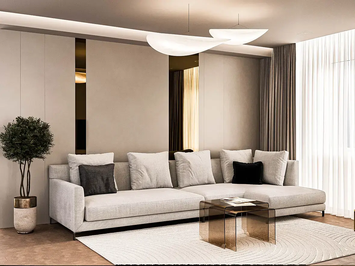 Пусто, сухо. проблемы в свете и материалах все темное и баланс белого съехал. столик низкополигональный, книжки и сумка в коридоре летают. Под дверью дырка. ковер и диван обрезан камерой. текстура на паркете не правильно натянута поперек длинны. черная подушка не в тему имхо. можно в фотошопе сделать чуть по лучше, но лучше в 3д настроить нормальный свет и материалы