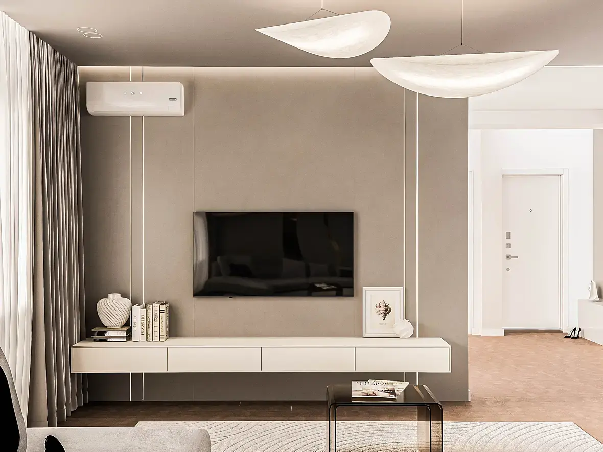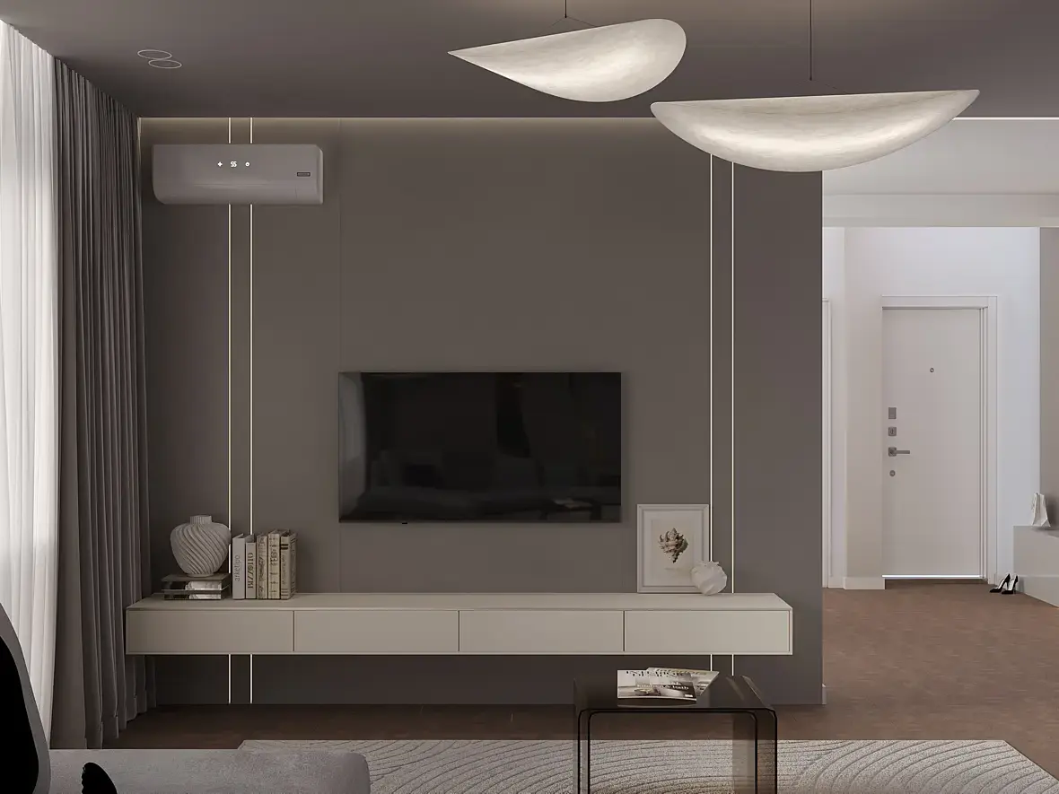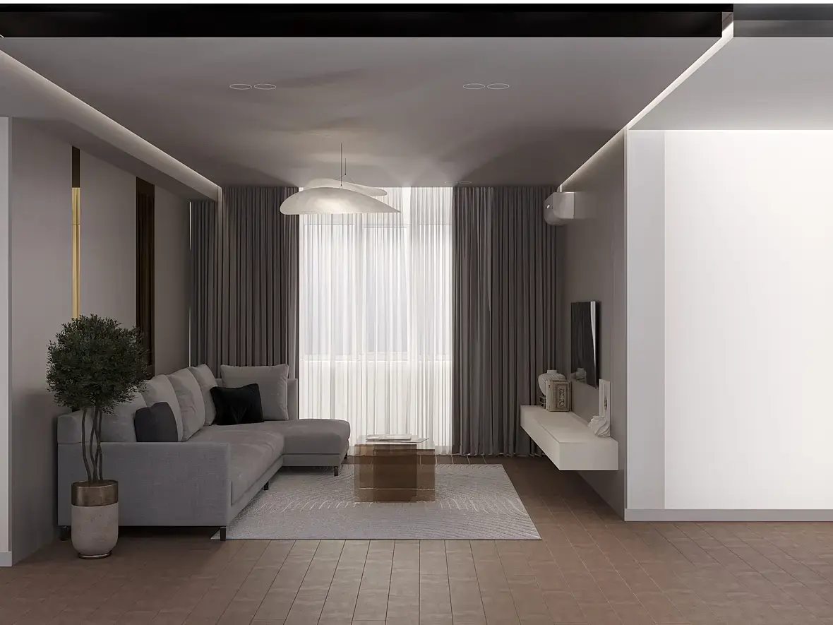 Пусто, сухо. проблемы в свете и материалах все темное и баланс белого съехал. столик низкополигональный, книжки и сумка в коридоре летают. Под дверью дырка. ковер и диван обрезан камерой. текстура на паркете не правильно натянута поперек длинны. черная подушка не в тему имхо. можно в фотошопе сделать чуть по лучше, но лучше в 3д настроить нормальный свет и материалы