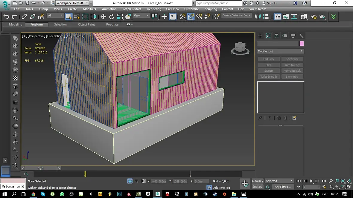 Модель простая, стены из сплайна, окна из бокса, облицовка - флор генератор, двери из старых проектов, фундамент - бокс.