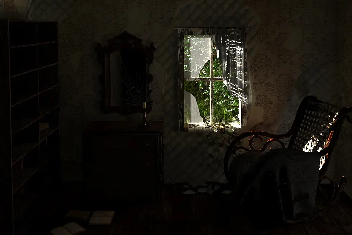 Недурно. Я бы ещё поработал над окном, подоконником (сами фрамуги тонкие, не хватает ручки, шпингалетов), раз они освещены. Не хватает немного света на полу или рефлекса на стене. Убрал бы шкаф слева(или заменил), какой-то он чересчур современный. Запылить зеркало, приглушить коричневый лак, кое где обломать старую резьбу. Паутина или разбитое оно - не понятно. Комод хорошо, но можно было достать немного из него покосившийся ящик. Нет, или они не убедительны, осколки на полу, подоконнике оконного стекла. Книги на полу слишком "новые". В общем, больше жизни! Тогда будет страшно! А не только за счёт темноты...