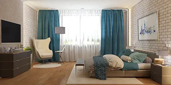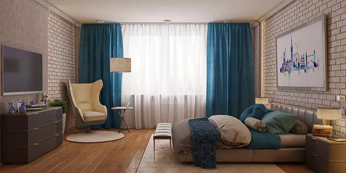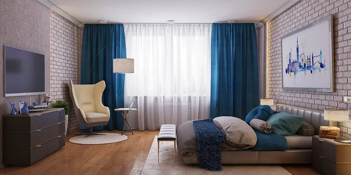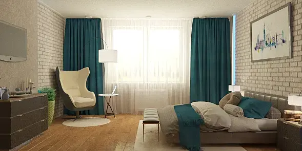 проверьте все текстуры) особенно на тв, такое ощущение что на нем совсем нет текстур)) его, кстати можно опустить ниже как и картину)) я бы еще проверила масштабы кровати и кресла) потому что главным акцентом в спальне является все-таки кровать)) у вас пока кресло выбивается)) либо другую модель кресла попробуйте) подсветку на стенах поменяйте на более теплый) на шторах нужно поправить текстуру и возможно выбрать цвет посложнее (погрязнее))) подушки и плед попробуйте сделать разных оттенков синего или из разной ткани (полосатые,клетчатые, с цветочным принтом )