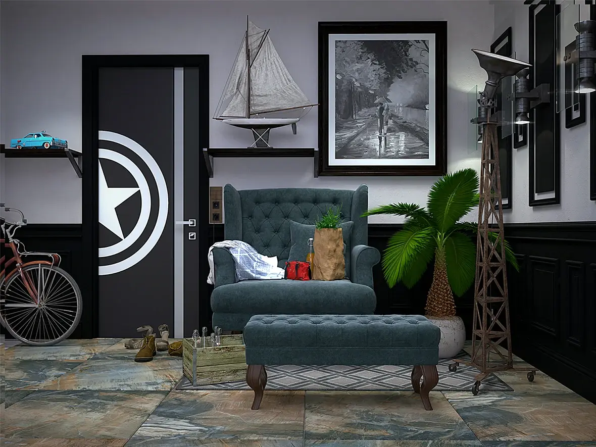 Добрый день! Материал велюра нужно настроить получше, сейчас он немного плоский и вообще я бы изменила цвет этого дивана и банкетки. Что касается композиции, деталей очень много и они разнятся между собой. Я бы подобрала детали в одном стиле. Ну и чтобы сделать более глубокую картинку стоит настроить свет, например центр композиции подсветить ярче, чем деверь с великом, а то получается пересвеченная ткань на диване не понятно почему.