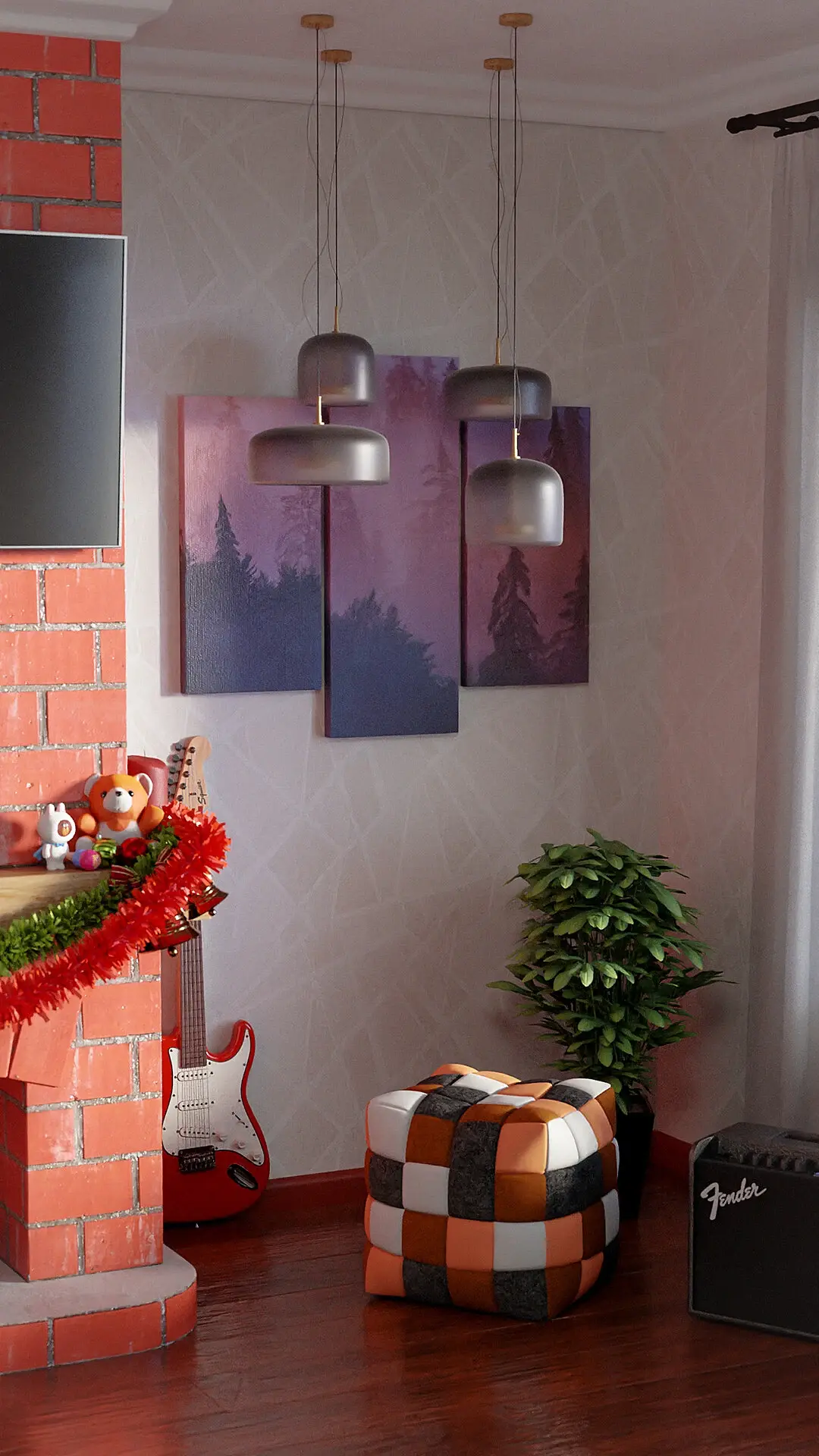 Камин ужасен на мой взгляд. Посмотрите на свои рефы, особенно первый, любо-дорого посмотреть, а Ваш выглядит как наружная стена кирпичного сарая. У меня создаётся стойкое ощущение, что сложить-то его сложили, а отделать забыли, поэтому и интерьер в целом выглядит недоделанным.