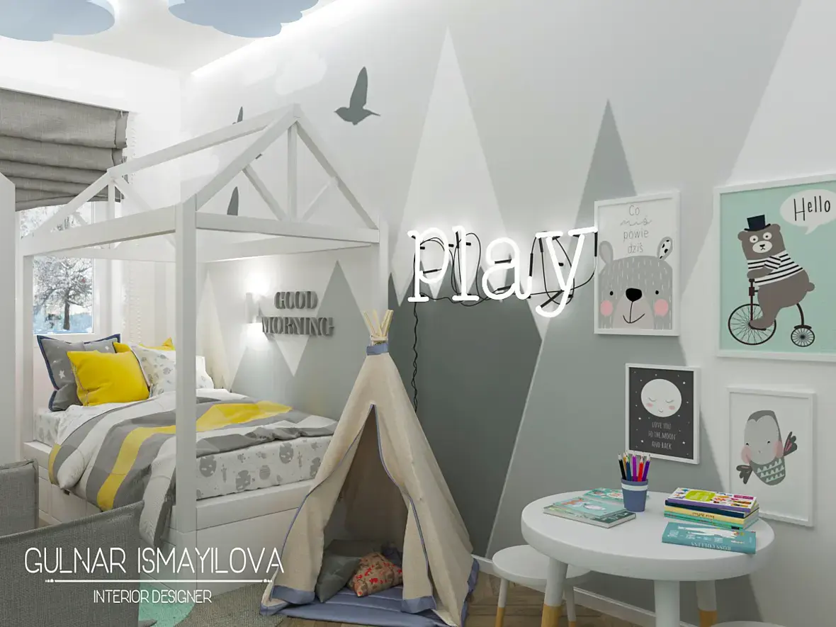 Я бы пересмотрел кровати в первую очередь. Их можно оставить, но убрать каркас в виде домика. Далее убрал бы надписи - гуд морнинг и светильники рядом с ними, светильники можно сделать в изголовье. Есть специальные, детские, мягкие, диодные светильники. Уберите светящуюся надпись - Играть.