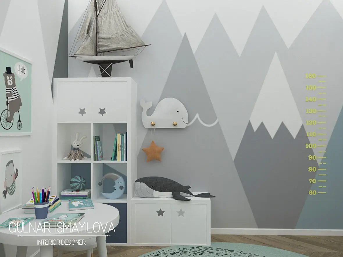 Много, много гор. Трафарет птиц серьезен для детй комнаты, надо что то более детско-мультяшное. Посередине "много гор" бъет цветовым пятном дом-полка. Суть ее в чем, если она закрыта наполовину не вписывающимся в общую картину креслом?