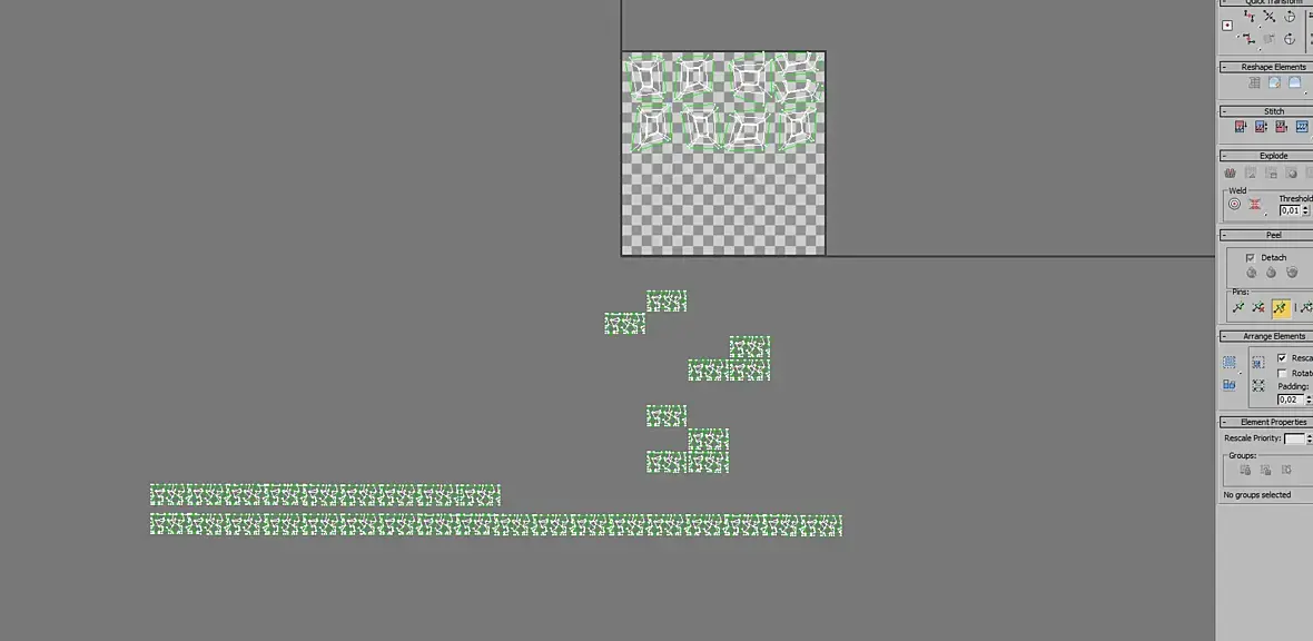 Сейчас я понял что нужно сначала развернуть этот маленький сегментик!причем шипы отдельно, отдельно боковышка и отдельно верх, сколапсить анварп а потом все манипуляции с постройкой всей резины. После этого когда колесо готово получится множество сегментов ровных и красивых остается их сшить между собой