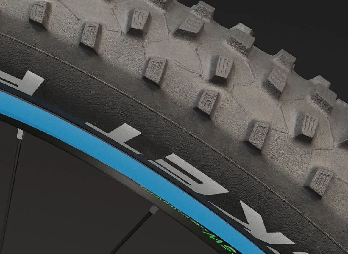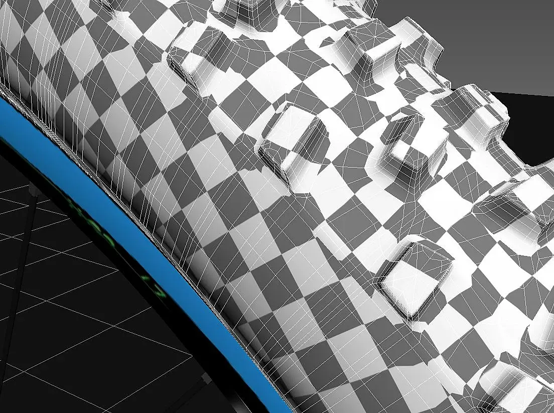 Я в начале делал так: моделил один сегмент с шипами, бендил подгонял чтоб он был по форме покрышки в фас и профиль, потом смещал центр в ноль и аррейем этот сегмент копировал и сшивал края сигментов меж собой , а только потом делал развертку в анварпе, развертка была кривой и не получалось красиво нарисовать на шипах прорези для бампа