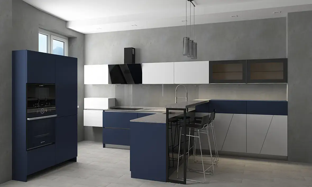 Какая глубина у шкафа для встраиваемой техники? Судя по рендеры она меньше, чем установочная глубина духовки. Да и техника далеко от рабочей зоны. Юзабилити шкафов справа тоже под вопросом, для хранения кухонной посуды типа кастрюль и тд очень далеко от рабочей поверхности, верхняя синяя часть вообще не предназначена для использования. Фасад мдф слева от плиты будет постоянно грязным и быстро придет в негодность. Верхний ящик над мойкой так же неудобен, соответственно посуду для сушки складывать в него не вариант, а значит для нее нет места. Видимо не зря проект не подошёл клиентам, функциональность этой кухни под большим вопросом.