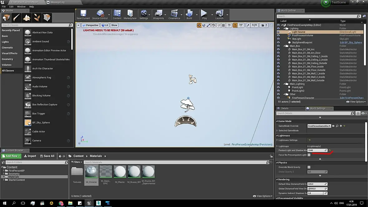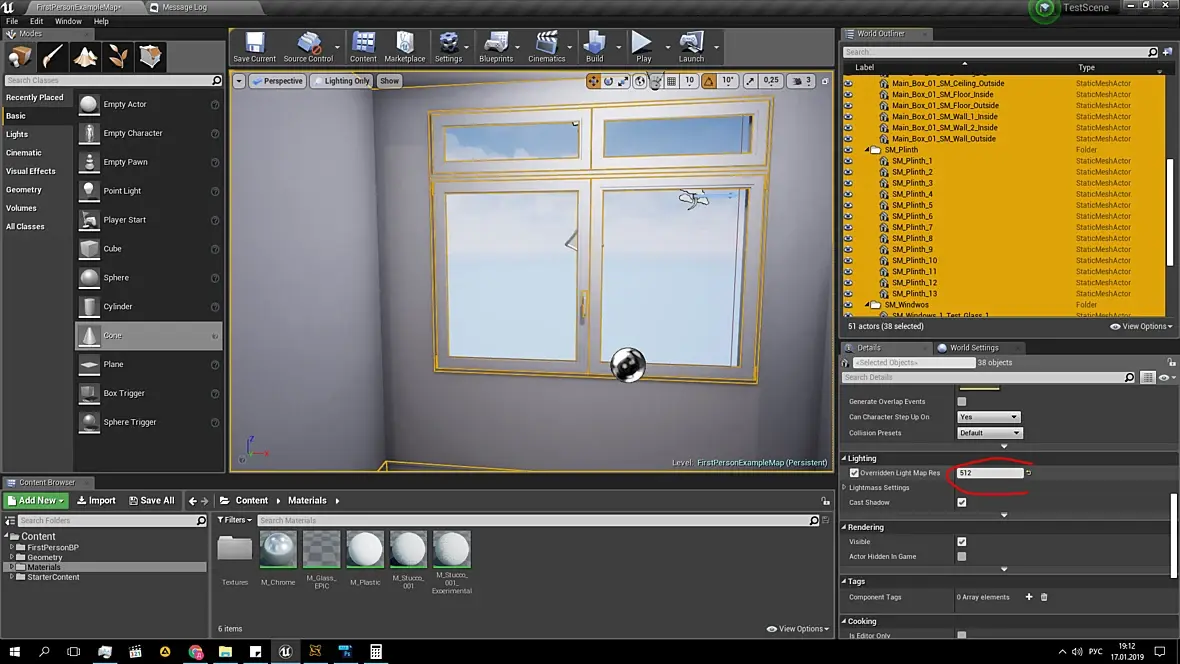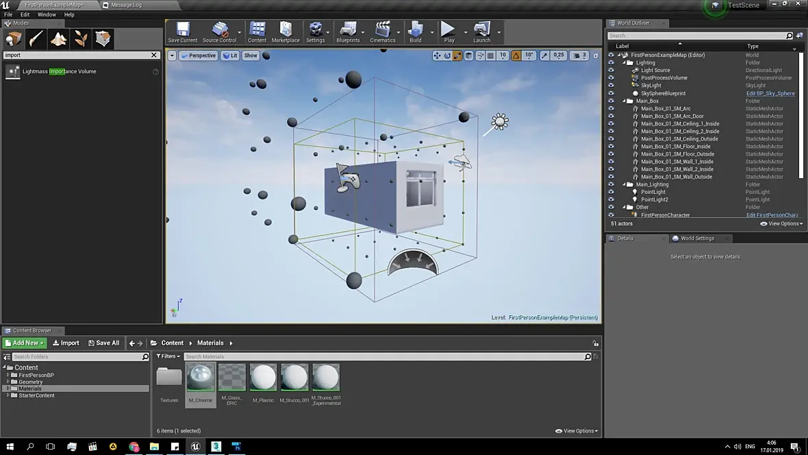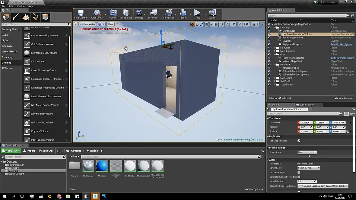 Уменьшу размер LightmassImportanceVolume до размера моей комнаты, меня не интересует что будет происходить снаружи. И буду молиться, что мне кто то подскажет, почему появляются лишние ВолюмСферы Лайтмапа.