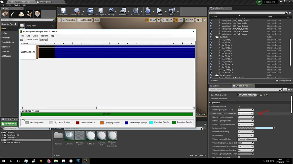 Нашёл в сцене ещё один источник света = SkyLight. Он стоял в режиме Stationary. Я перевёл его в Static, думаю это должно ускорить просчёт и снизить нагрузку на память. Пока в планах только статика. Так же я поднял до 10 Num Sky Lighting Bounces. Итог: 736 секунд. Хотя раньше было 720. Думал перевод SkyLight в Static даст более существенный положительный результат. Отнесём погрешность в 16 секунд на русскую рулетку.