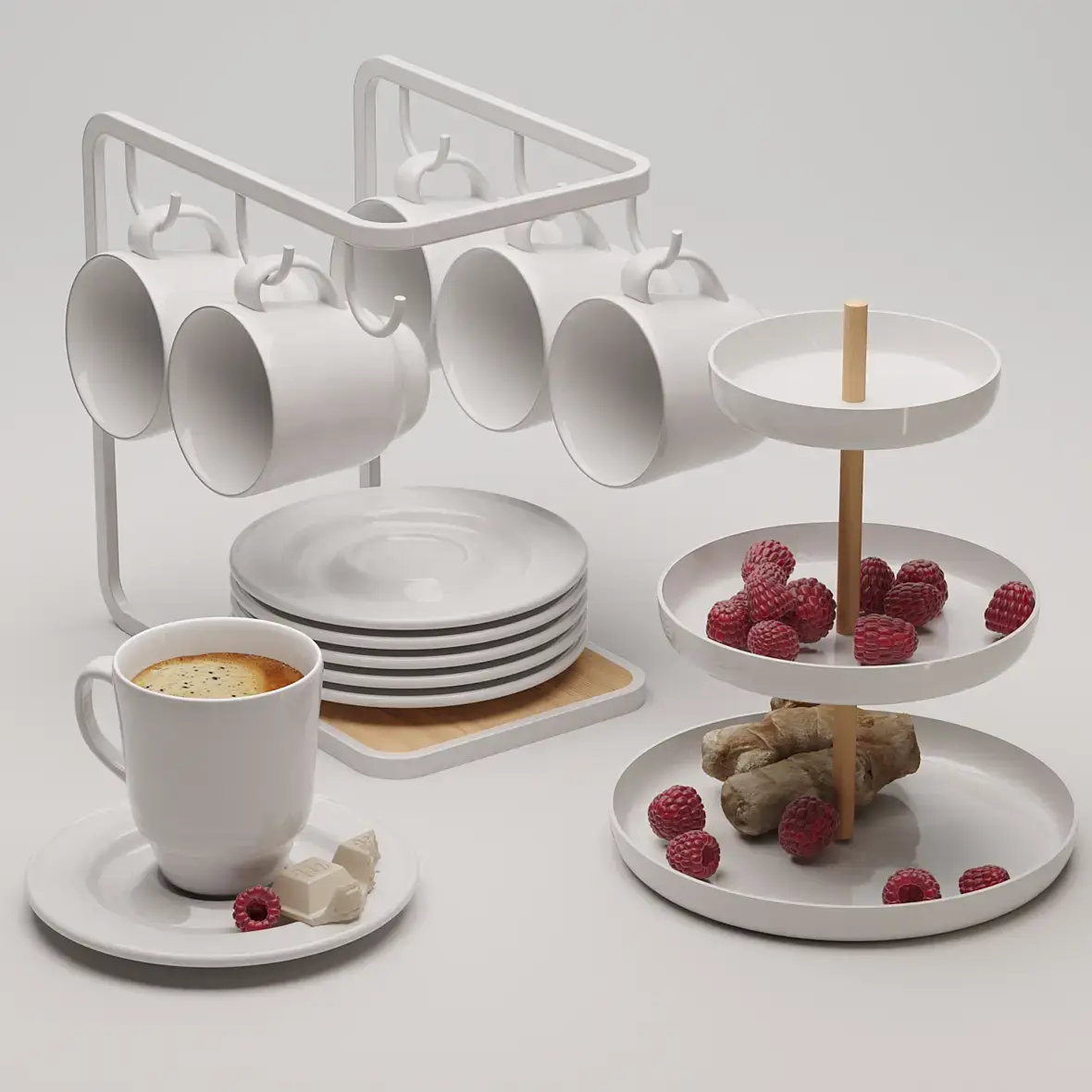 Короч, слева направо - чашка с кофе, малина, а сзади подставка на втором плане. Типа как вторая картинка, только развернуть чашки к нам не донышками, а дырками. И камеру ниже.