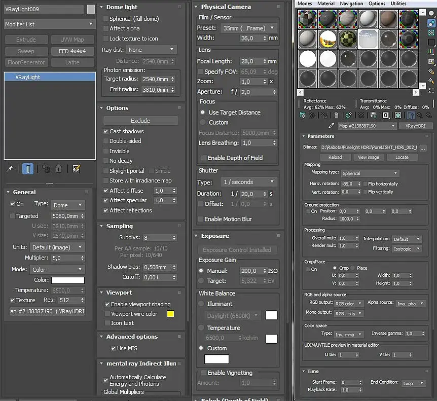 Прикрепляю настройки Vray, камеры и самого HDRI с Dome