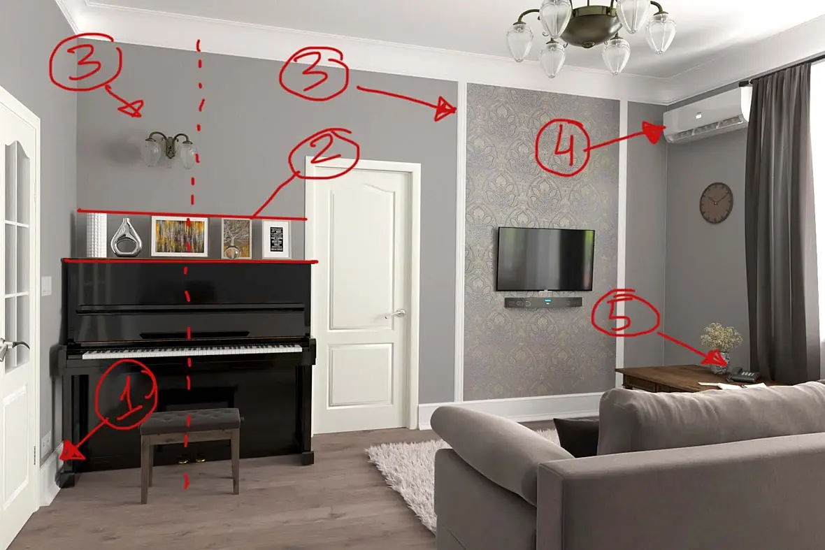3. Эти два молдинга обрамляющие обои смотрятся очень неуместно. Начиная с того что они делят пространство и визуально уменьшают комнату и заканчивая орнаментом обоев, который смотрится лишним в интерьере.