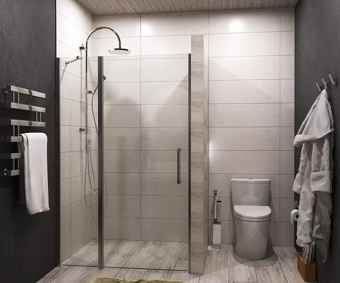 уклон пола я думаю это не обязательный параметр в рендере, вряд ли он будет заметен в результате, по крайней мере в данном моём случае, слив будет через душевой лоток Advantix Vario, если внимательнее посмотрите, щель в плитке для лотка видна сразу за ограждением.