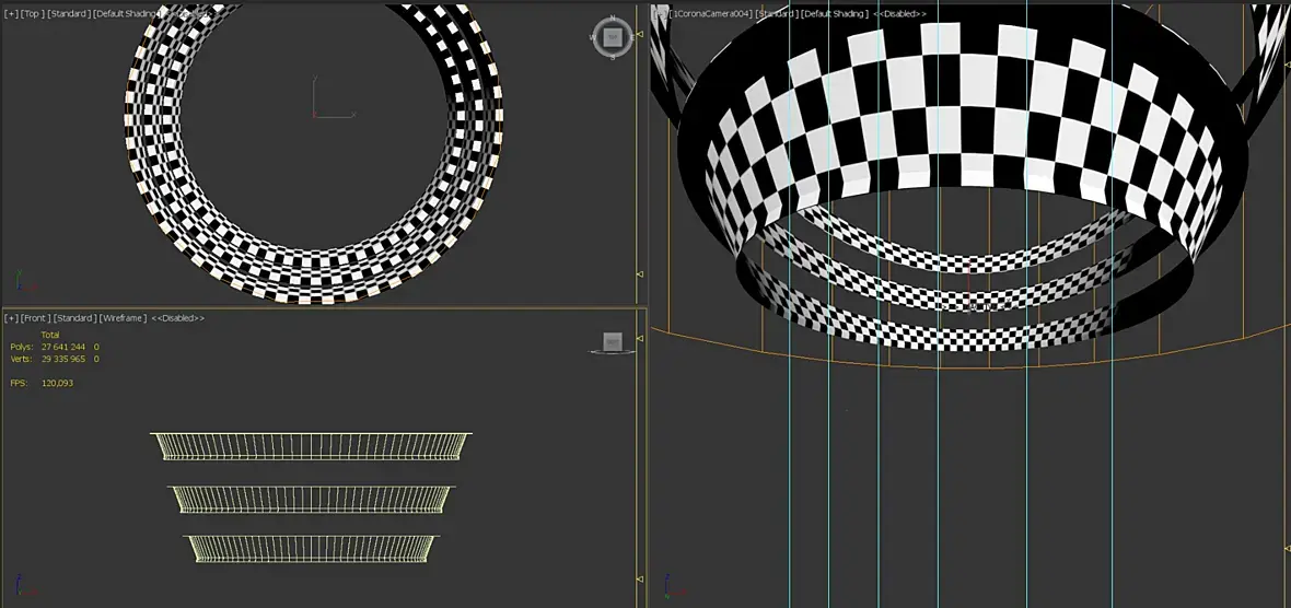 Как сделать чтоб на такой геометрии вертикали текстуры стали строго вертикальными со всех ракурсов? (соответствовали голубым направляющим). Я так понимаю, что текстуринг тут должен исказится и стать вроде как коническим, но как это сделать, я не могу понять. Ну и еще чтоб с любой точки этого круга как бы мы не стали, надо чтоб были вертикали вертикальными.